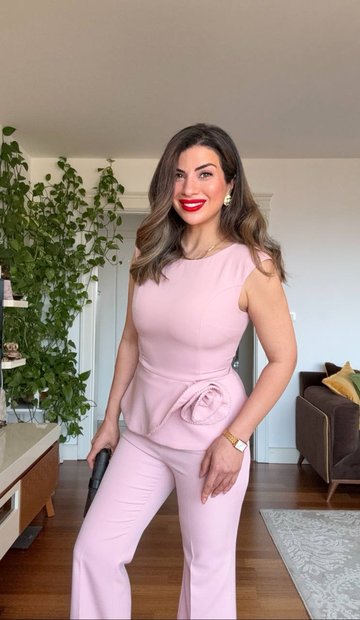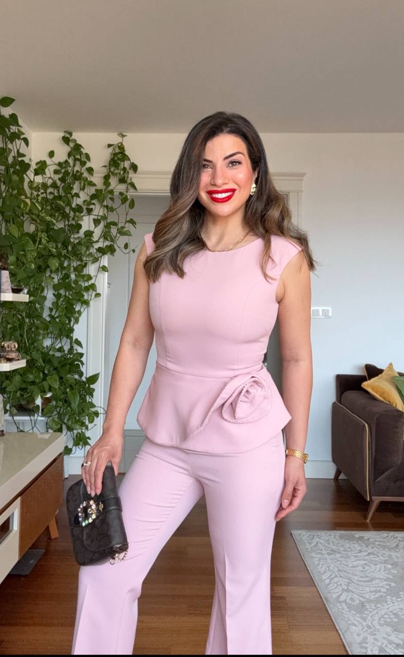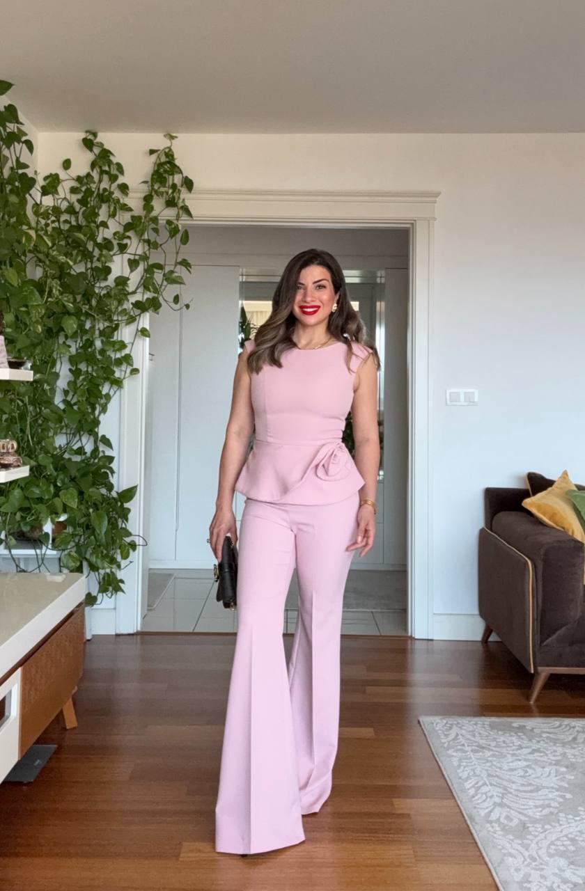 Offering a modern interpretation of flawless elegance, this powder suit is designed to reflect your style in every setting—from special events to business meetings. The body-hugging silhouette, elegant peplum cut, and delicate flower-shaped detail make this piece truly stand out. The sleeveless top provides comfort during warmer months and can easily be paired with a blazer. The wide-leg pants visually elongate the legs while adding a sophisticated touch.