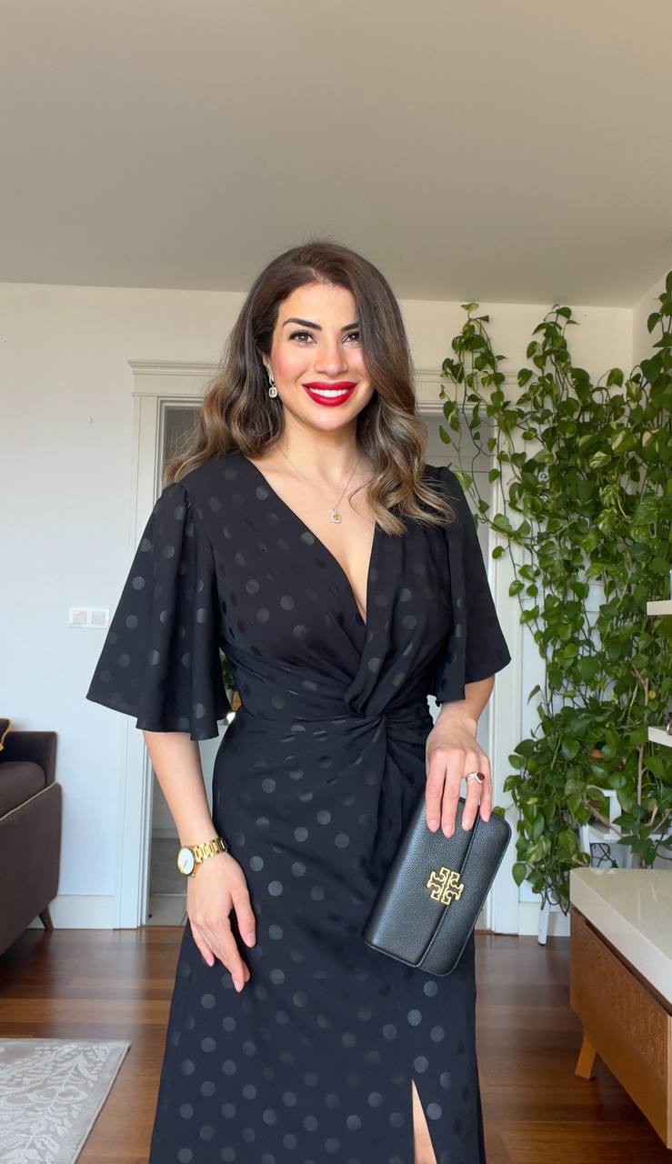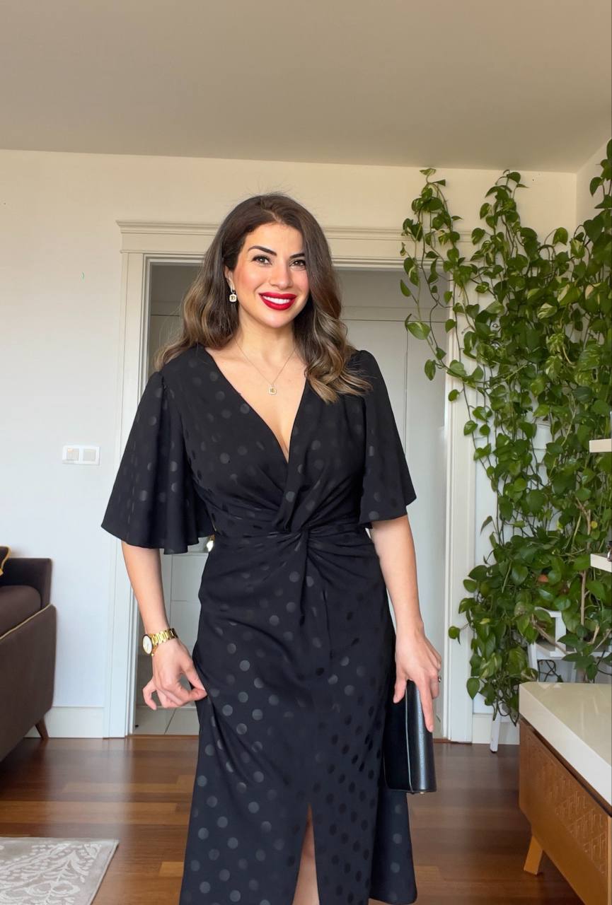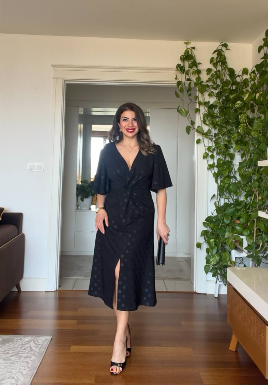 This midi-length dress stands out with its black polka dot pattern on a black background. Featuring a wrap neckline and a gathered detail at the waist, it creates a feminine silhouette. The flutter short sleeves offer a light and comfortable feel, making it an ideal choice for both everyday looks and special occasions.