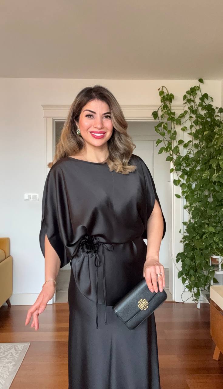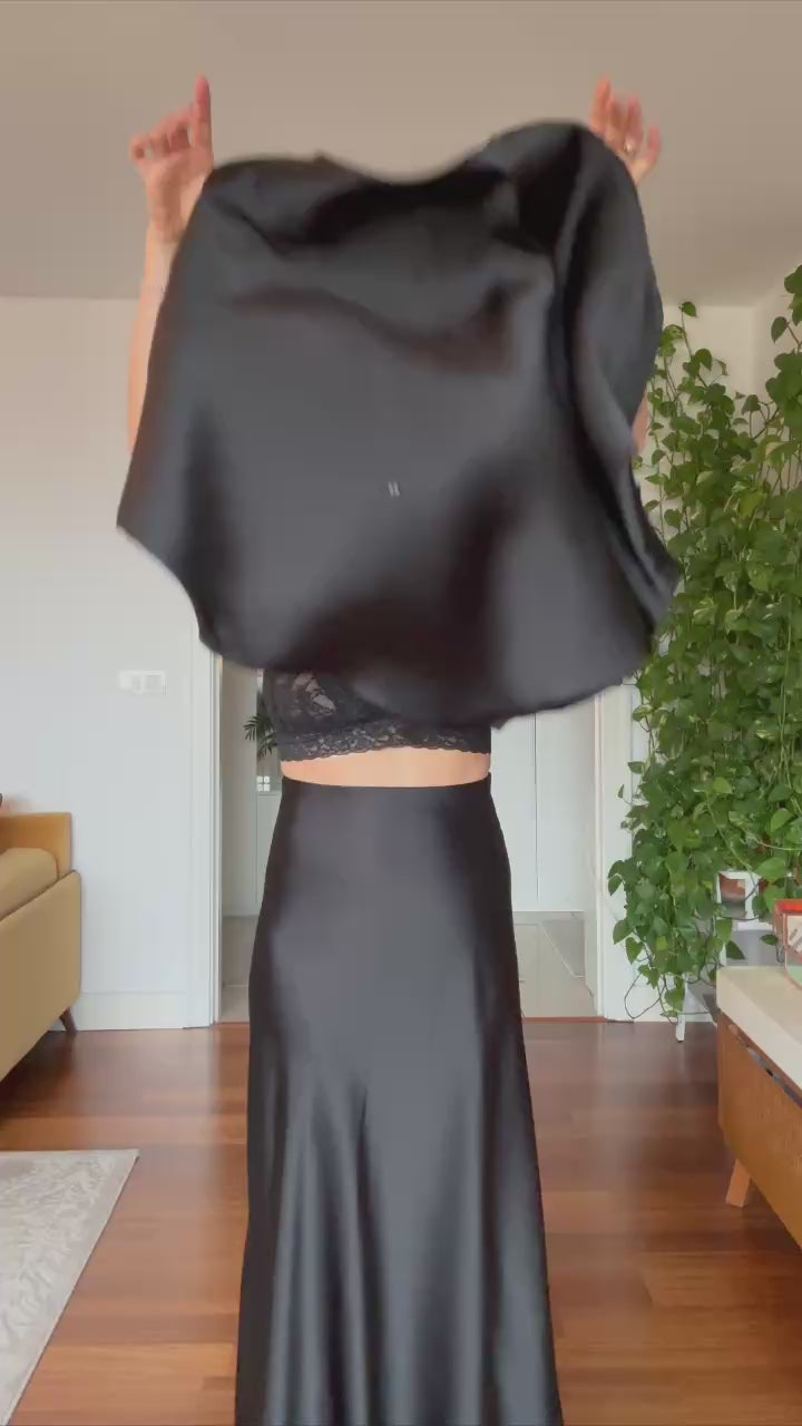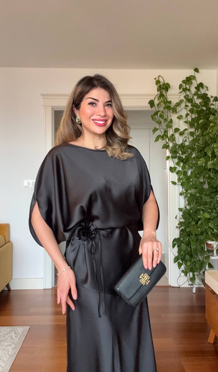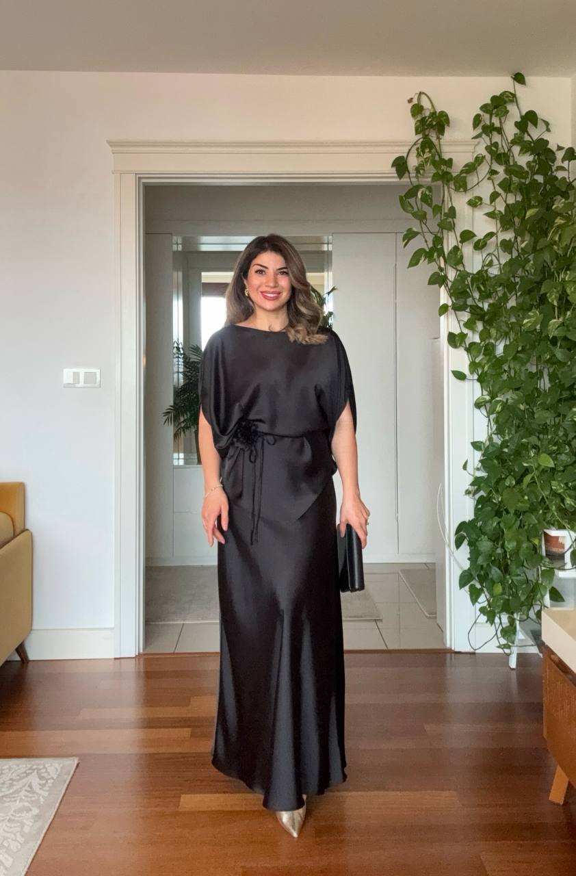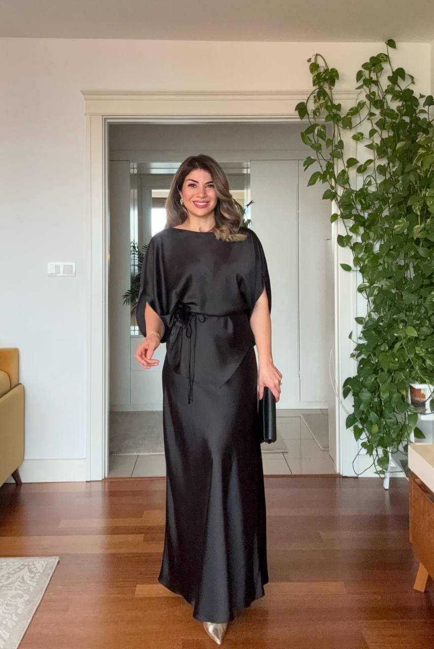 Designed with a fluid satin texture and an elegant silhouette, this belt-tied two-piece set offers timeless sophistication for special occasions and evening events.
