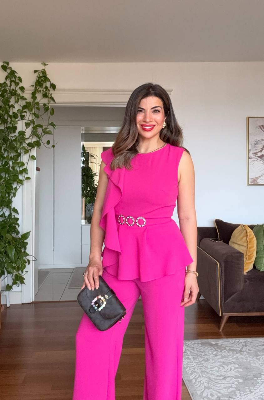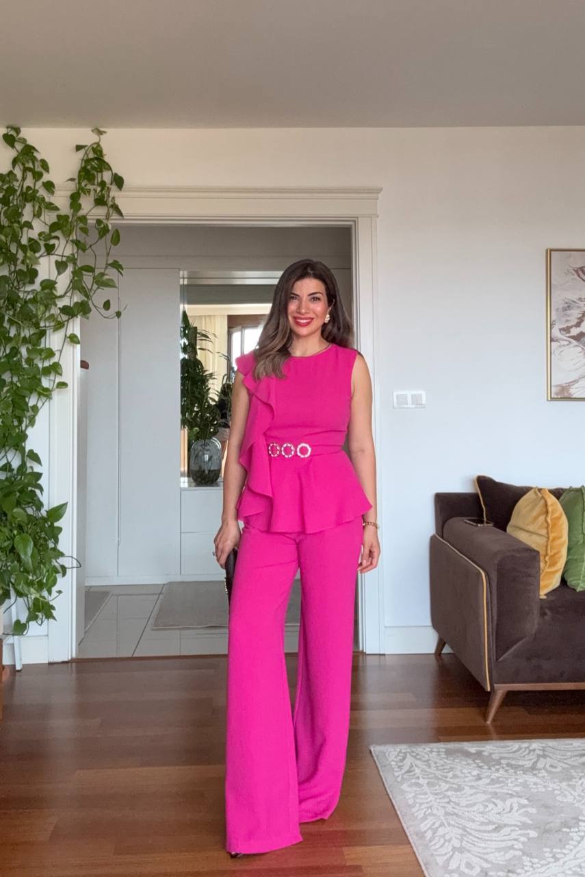 This chic set stands out with its vibrant fuchsia tone, reflecting your energy and modern femininity. The ruffle detail on the shoulder and the fitted top create an elegant silhouette, while the rhinestone belt adds a sparkling touch that accentuates the waist.