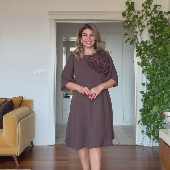The Short Dress with Large Floral Detail stands out with its warm and elegant cocoa brown tone, offering a modern yet romantic charm. The statement 3D flower applique on the chest adds a soft feminine touch, while the thin matching belt beautifully defines the waistline. The knee-length A-line silhouette ensures both comfort and timeless style.