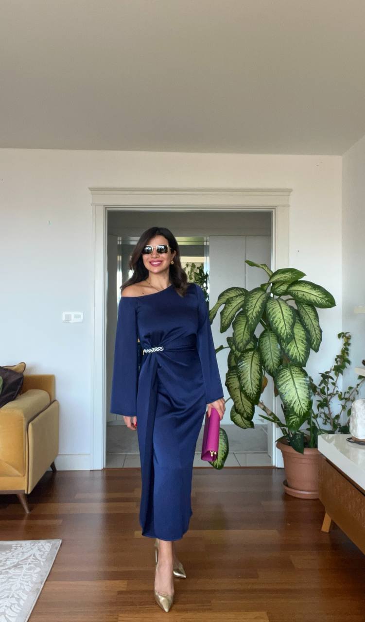 This mint one-shoulder dress, where minimalism meets elegant details, offers sophisticated chic. With its fluid fabric and modern cut, the dress gently hugs the body and presents a unique stance with its wide sleeves. The braided detail belt at the waist subtly emphasizes femininity. It’s the perfect choice for showcasing your elegance at evening events or special occasions. This dress, easily complemented with shoes and accessories, will become an indispensable piece in your wardrobe.