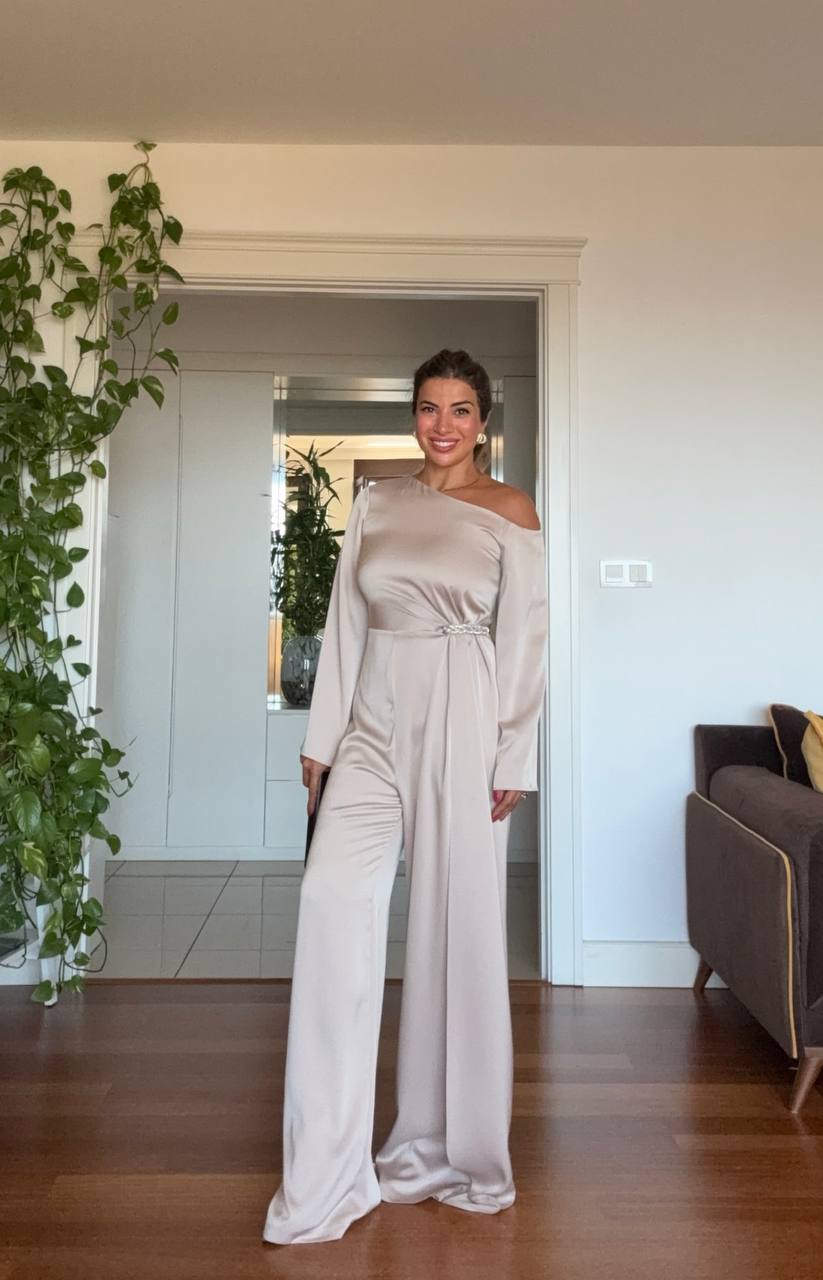 This elegant beige playsuit offers a modern and sophisticated look. With its one-shoulder detail adding a graceful touch to its chic design, this piece presents a balanced design that highlights the body shape with its wide-leg cut and silver accessory detail at the waist. Perfect for both daytime and evening elegance, this playsuit combines comfort and aesthetics with its relaxed fit and flowing fabric. If you want to stand out with your style at special events, business meetings, or chic evening dinners, this playsuit is just for you!