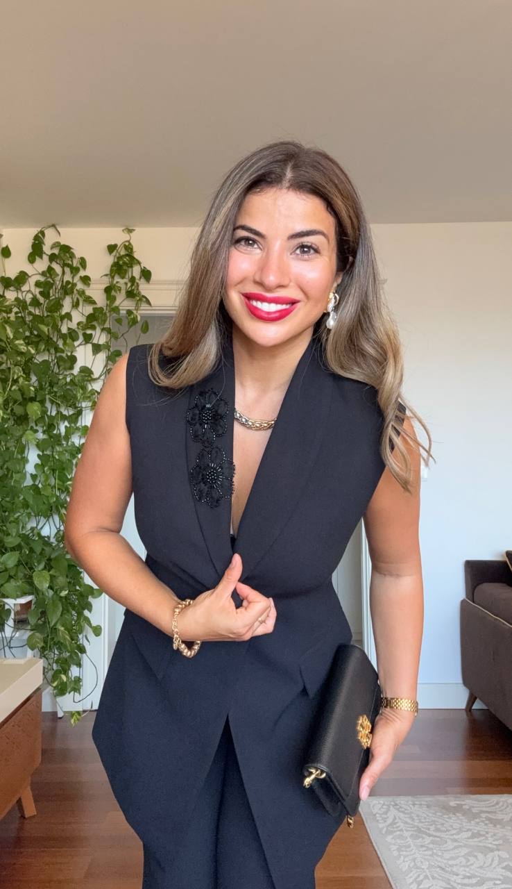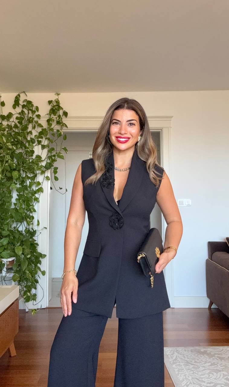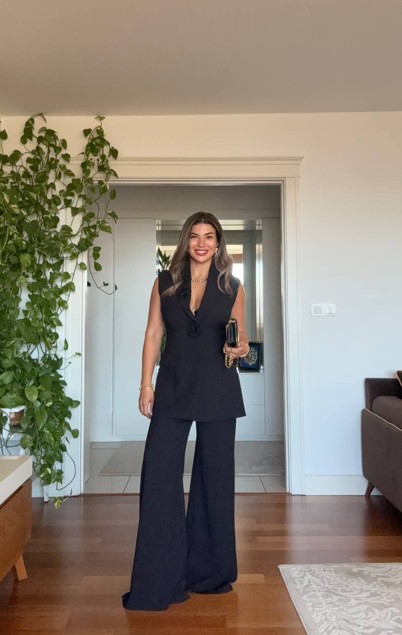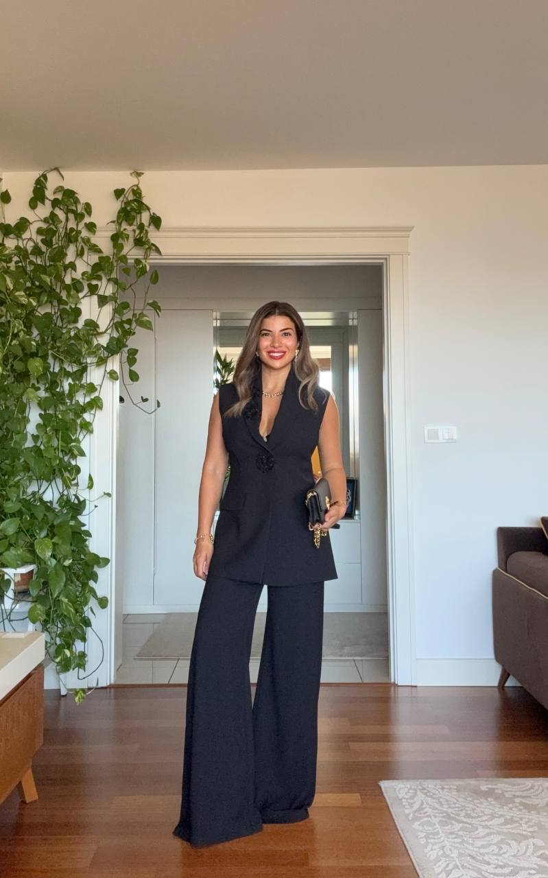 A modern take on timeless elegance: This black set combines power and grace in perfect harmony. The sleeveless blazer hugs the body to create a feminine silhouette, while the floral button details add a touch of elegance. The wide-leg palazzo pants offer both comfort and a sophisticated look.