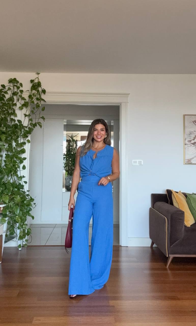 Combining comfort and elegance, this cobalt blue linen set is a summer must-have. The sleeveless top features front button details and a gathered knot design for a modern touch, while the high-waisted, wide-leg pants create a graceful silhouette.