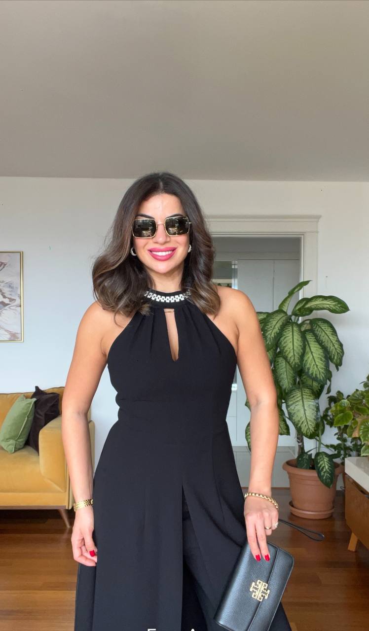 This black wide-legged jumpsuit, standing out with its dazzling elegance, is a must-have in every woman's wardrobe. With its modern cut and relaxed, flowing form, it offers comfort throughout the day while complementing your style at evening events. The delicate window detail on the upper part and pearl-like accessories add a minimalistic touch.