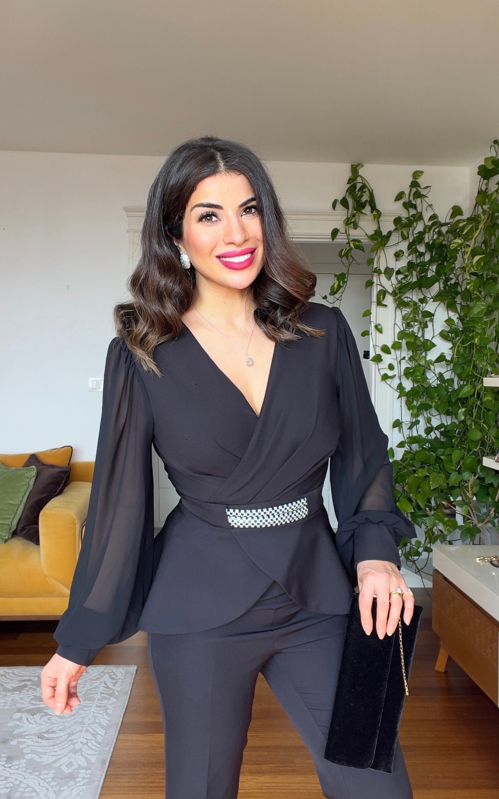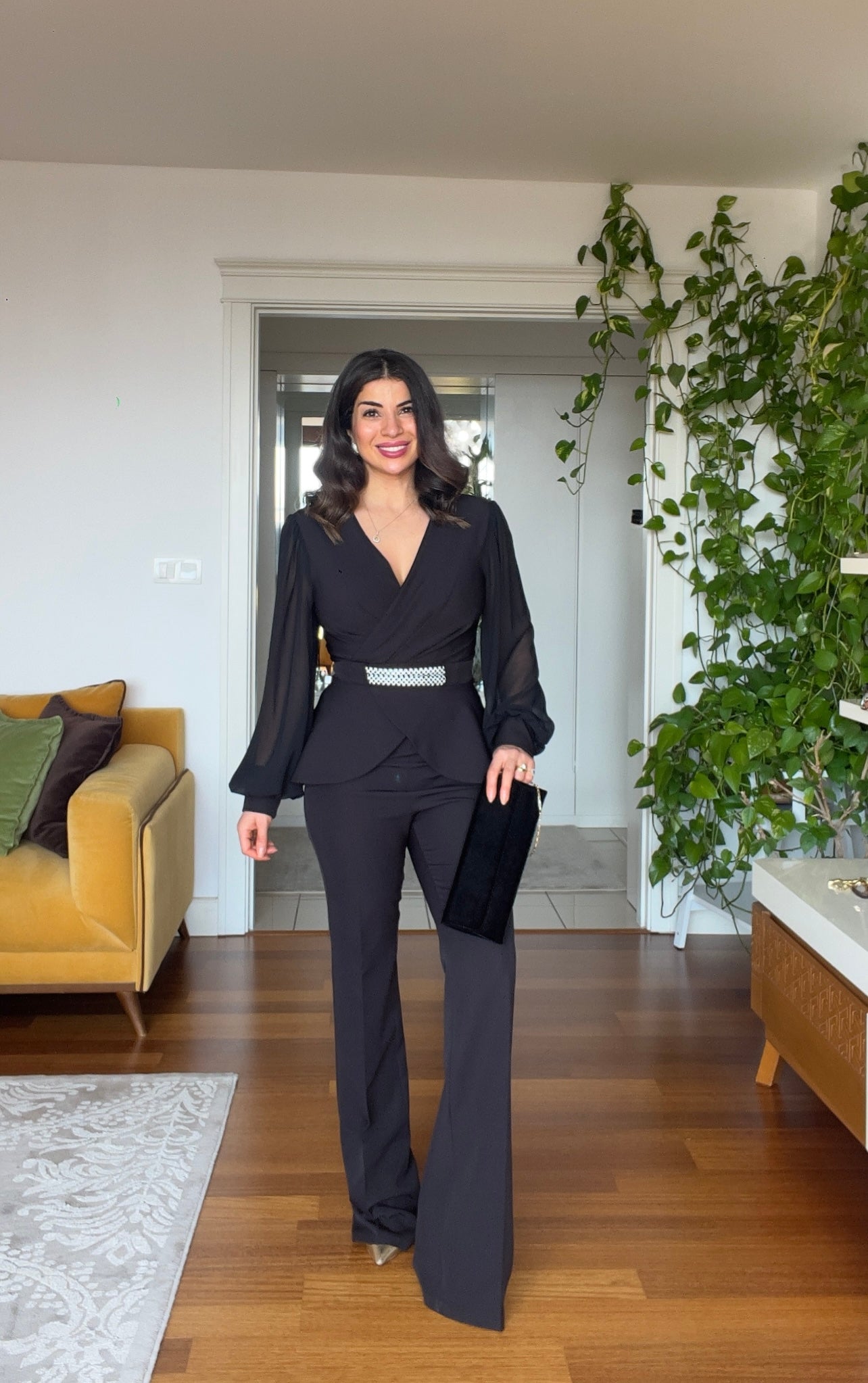 Designed for women who want to stand out in every setting, this stunning black suit combines elegance with modern sophistication. Featuring chiffon-detailed sleeves, a sparkling belt that accentuates the waist, and a flawless fit, it is perfect for both special occasions and professional settings.