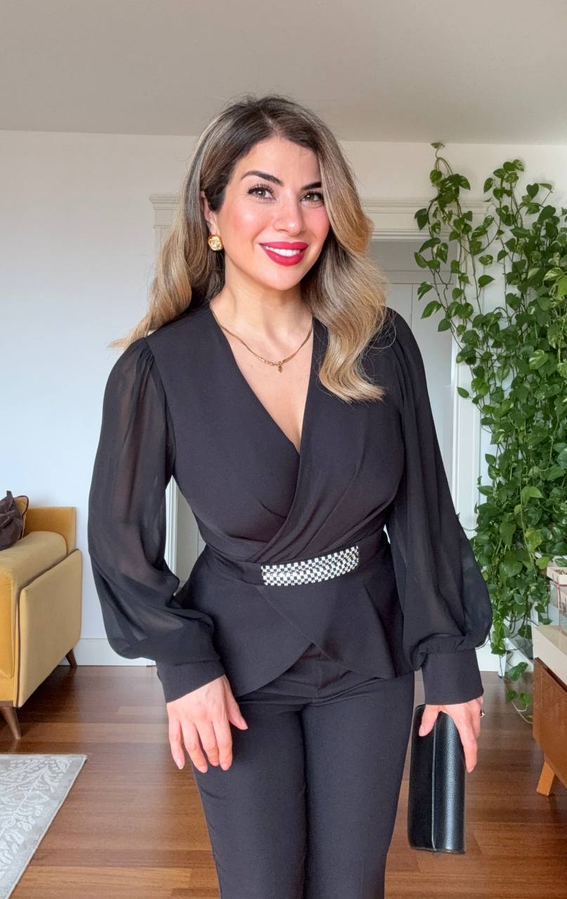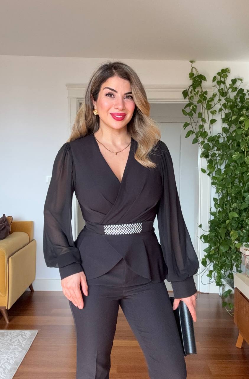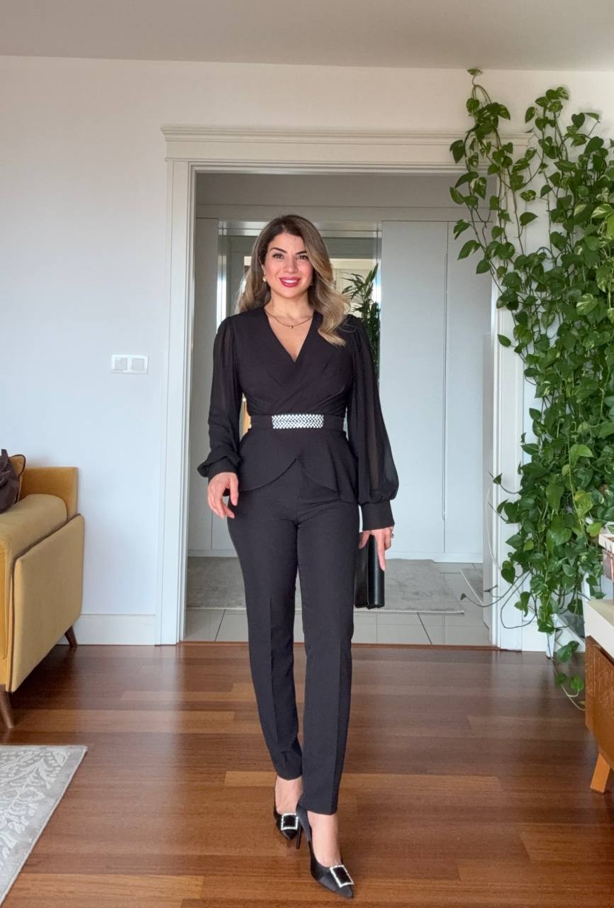 Designed for women who want to stand out in every setting, this stunning black suit combines elegance with modern sophistication. Featuring chiffon-detailed sleeves, a sparkling belt that accentuates the waist, and a flawless fit, it is perfect for both special occasions and professional settings.