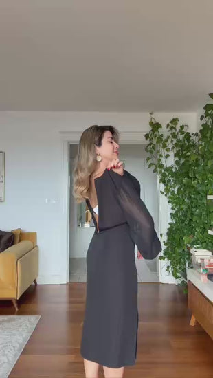 Thanks to its special design, it elegantly emphasizes the body's curves, while the stylish details at the waist create a feminine silhouette. The slight opening in the long chiffon sleeves adds a modern touch, making it compatible with every style in different color options.