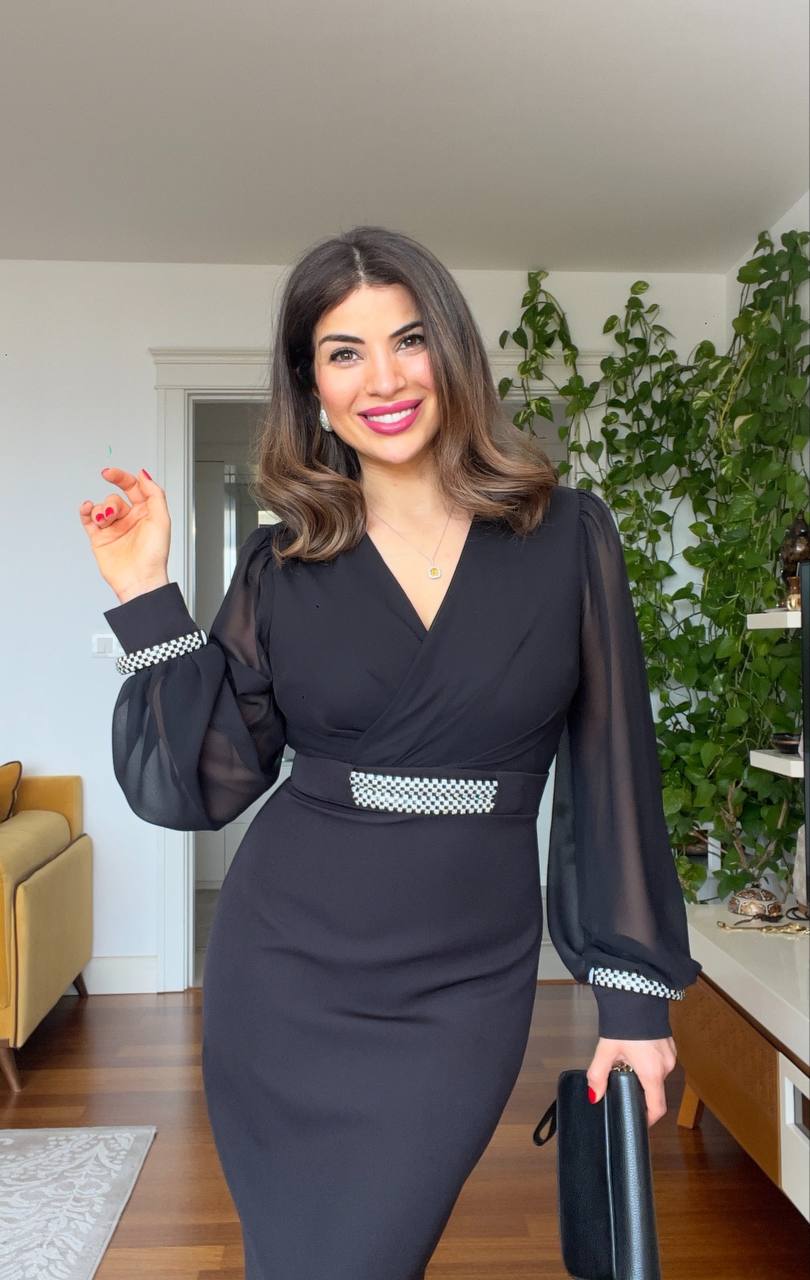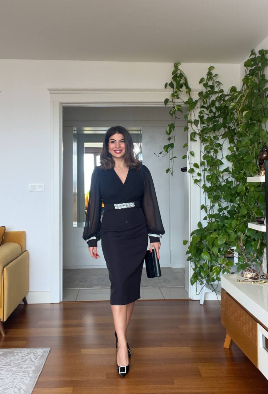 Designed with timeless elegance and modern details, this stunning dress will make you stand out at any event, from special occasions to business meetings. The white chiffon top with a graceful V-neckline and stylish cuff details adds a sophisticated touch, while the black pencil skirt creates a flattering, feminine silhouette.