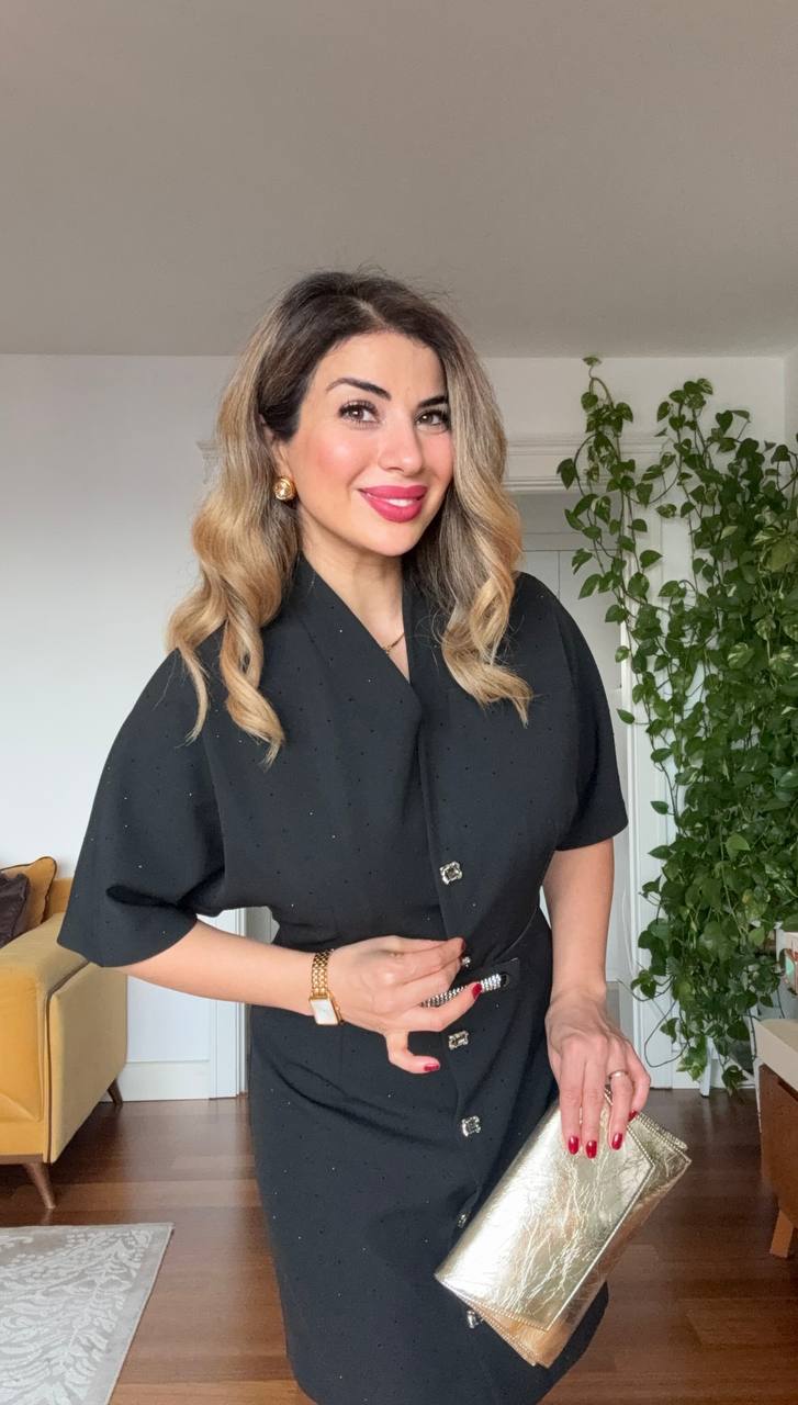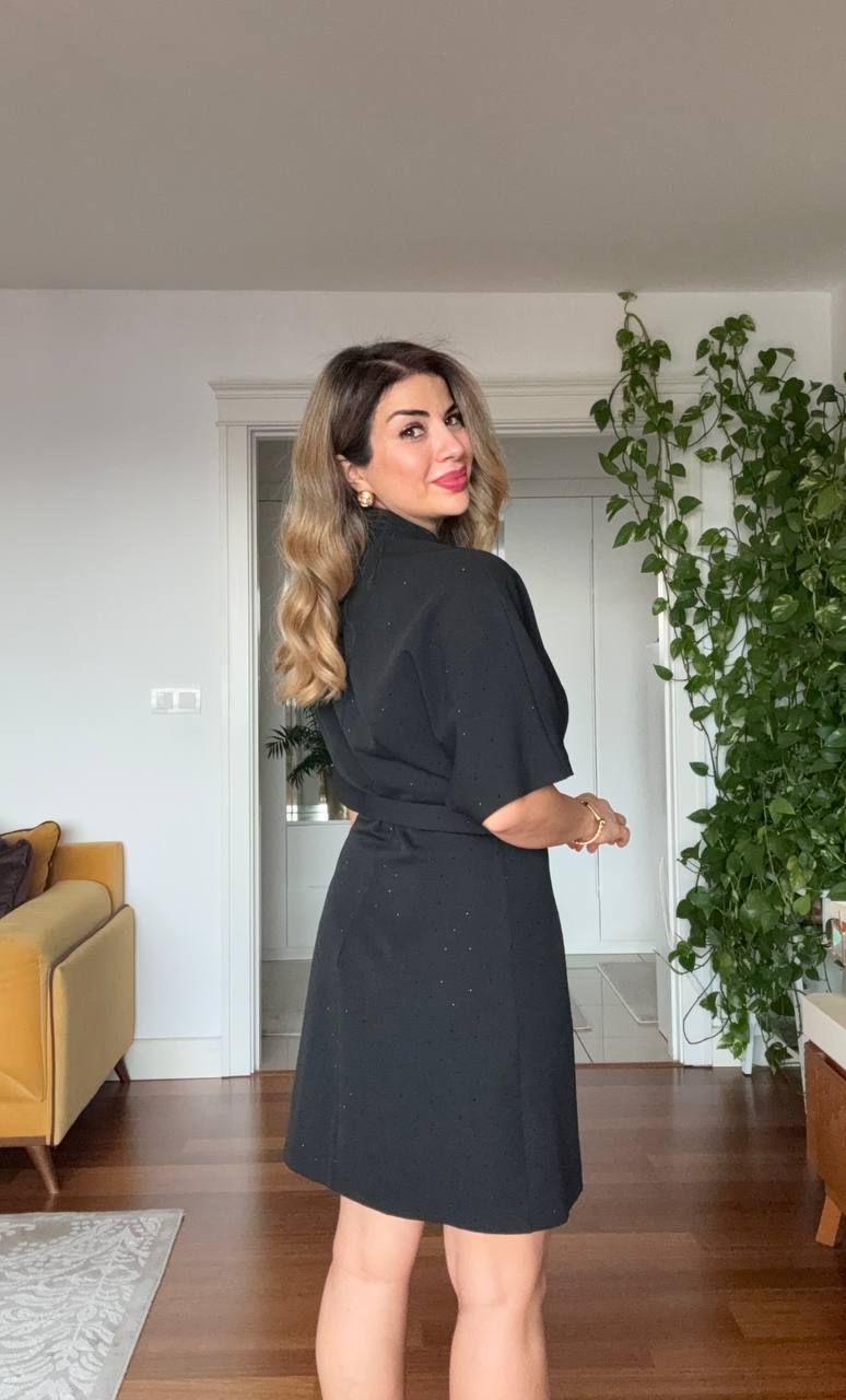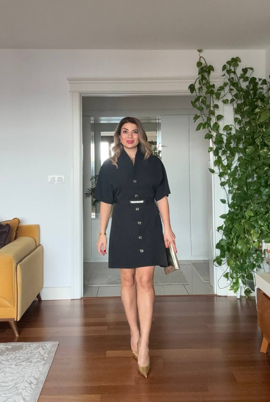 The belt detail at the waist gently highlights the body shape, and its comfortable fit ensures ease of wear throughout the day. With its short sleeves and mini length, this dress can be effortlessly styled for both daytime looks and evening events. When paired with high heels and a clutch bag, it creates a bold and elegant outfit.