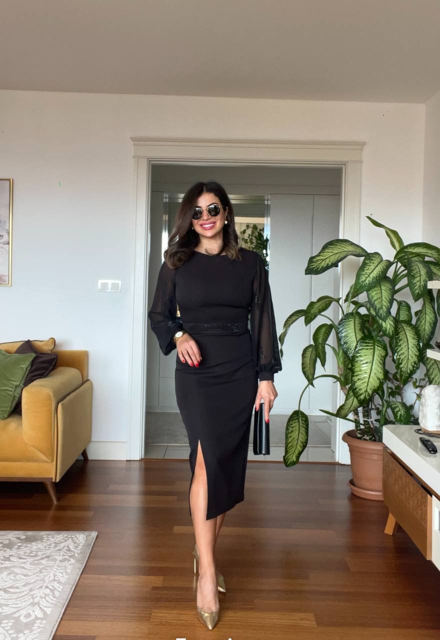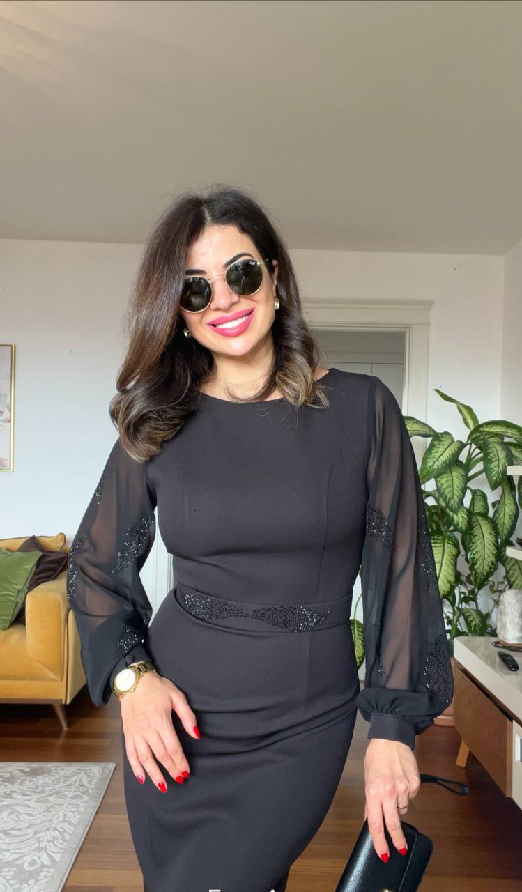Modern Design: The transparent, lace-detailed sleeves and stone embellishment at the waist add a refined touch to the dress, perfectly emphasizing your body shape. Comfortable Wear: Its soft fabric offers both style and comfort. Versatile Styles: This dress allows you to create different looks with the right shoe and accessory combinations. Achieve a chic look with high heels, or a relaxed vibe with flat shoes.