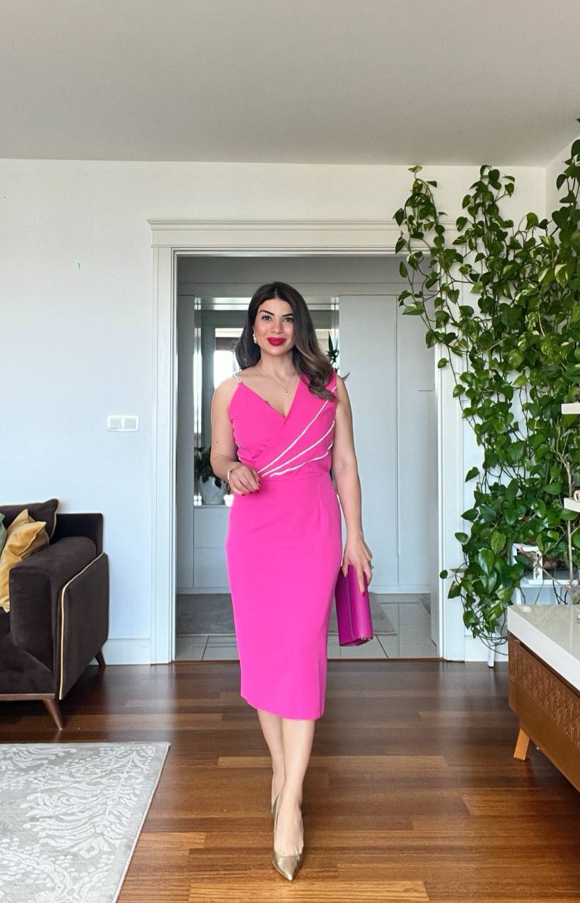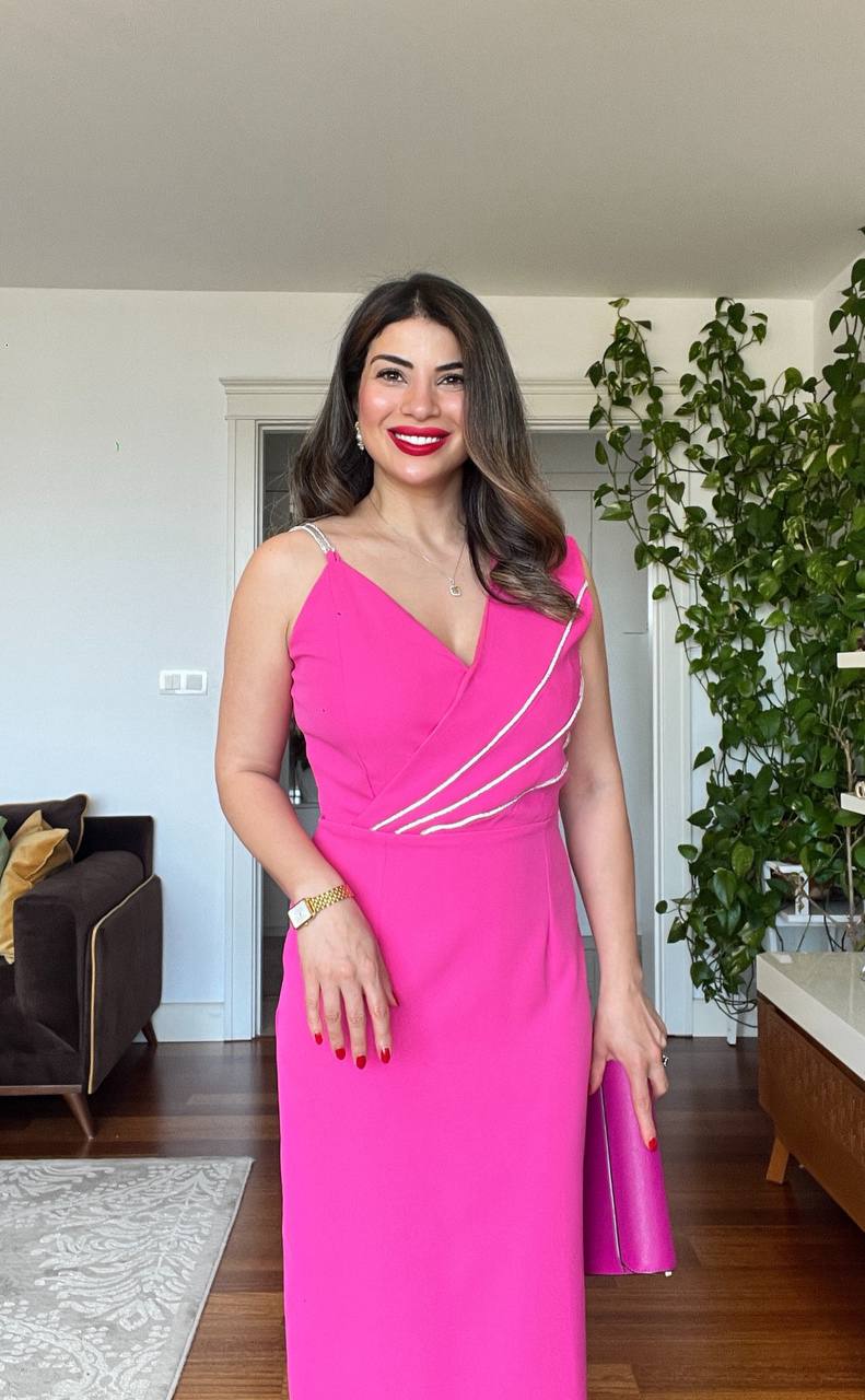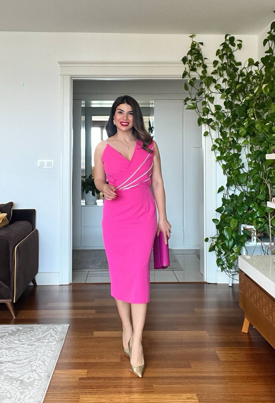 This vibrant fuchsia midi pencil dress combines elegance and femininity in a striking way. The delicate straps adorned with shimmering stone details and the cross-draped bodice add a touch of sparkle and modern flair to the design.