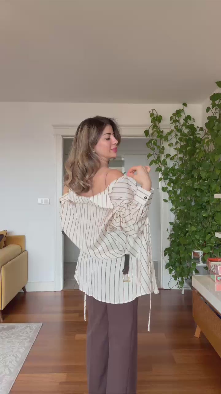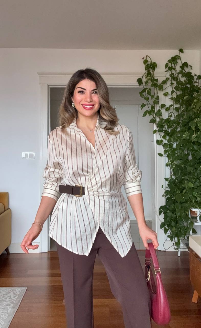 The beige striped shirt features a belted waist design that subtly defines the silhouette, creating a flattering and feminine shape. Its relaxed fit and soft-textured fabric ensure all-day comfort, while the brown wide leg trousers add a sophisticated and polished touch to the overall look.