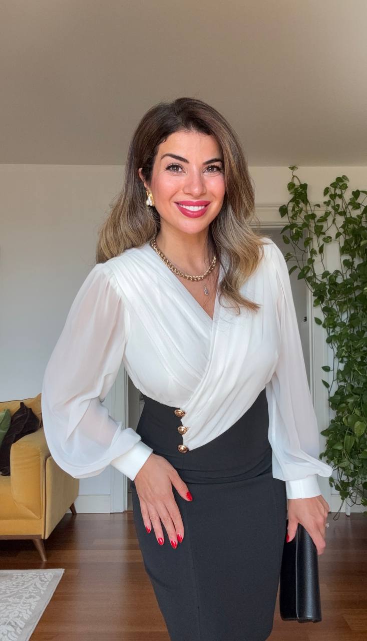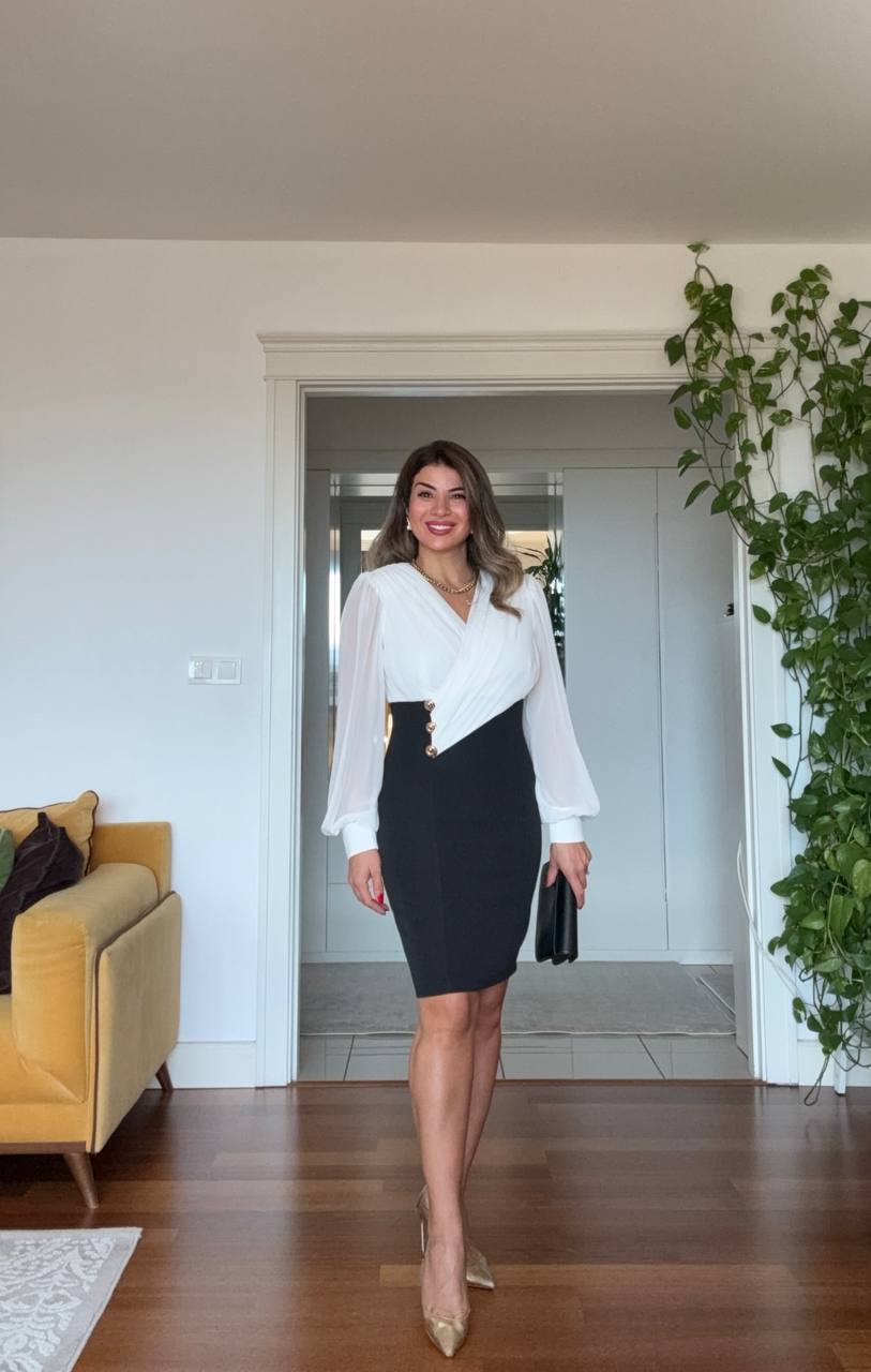 - Skirt: Knee-length, body-hugging black skirt provides a classic yet chic silhouette.