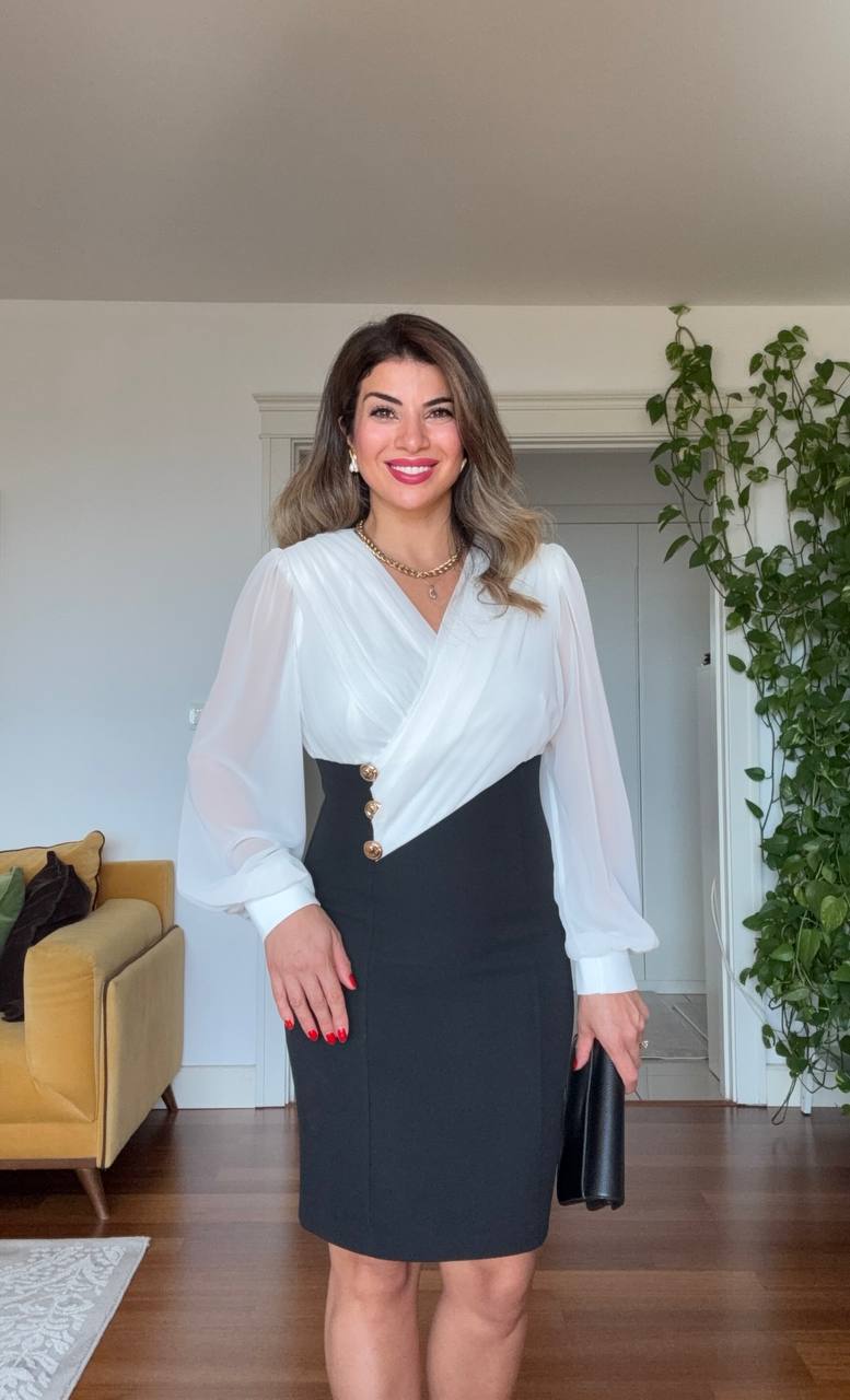 Combining elegance and sophistication, the Three-Button Detail Wrap Dress – Black & White is designed to highlight your style in both special occasions and professional settings.