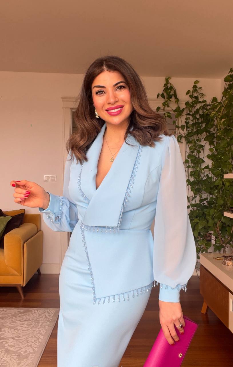 Blue is one of the essential colors in every woman's wardrobe and always represents elegance. Therefore, the black color of the Tulle Sleeve Stone Detailed Dress perfectly complements its design. The combination of blue with the tulle details on the sleeves offers an extremely attractive and sophisticated look.