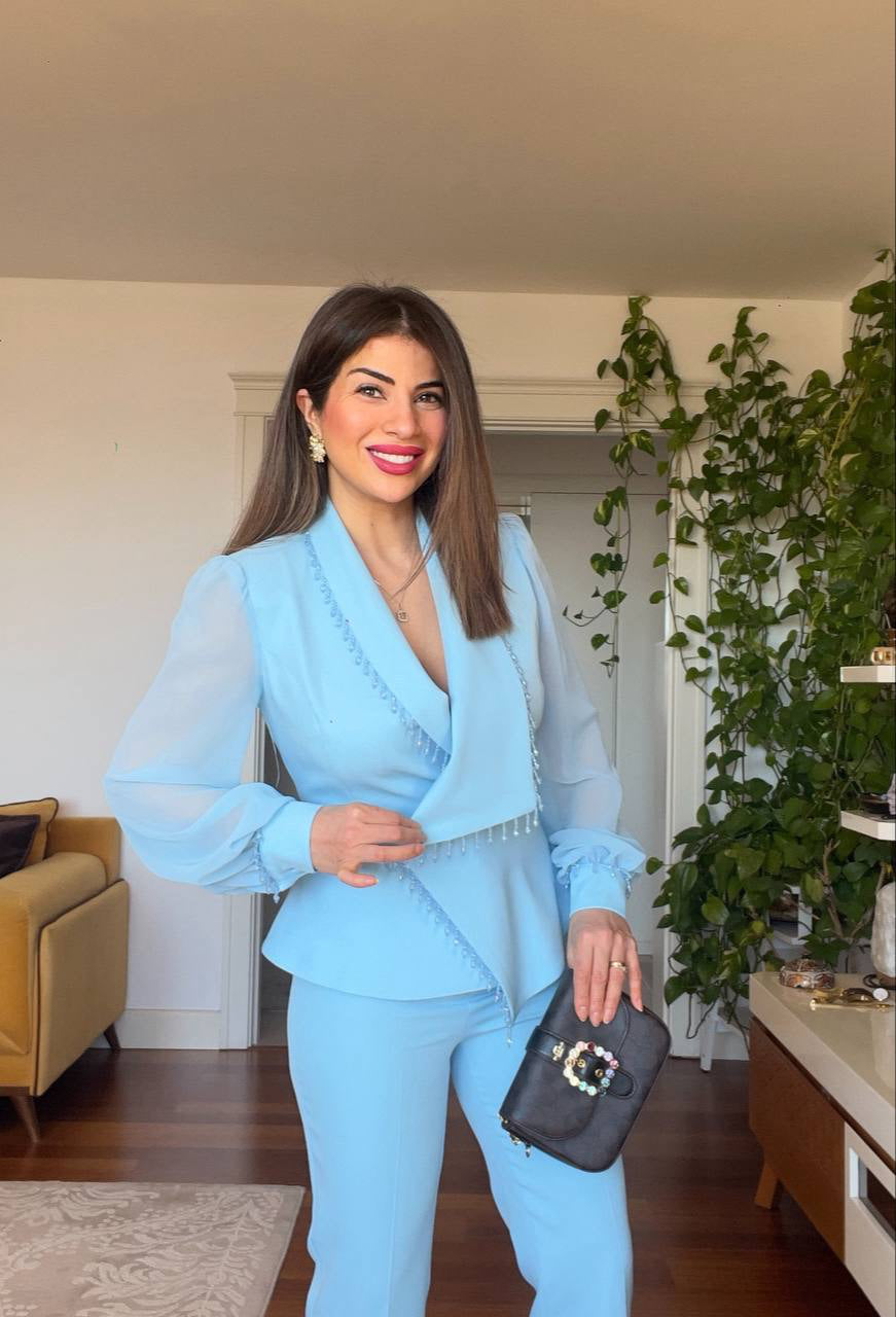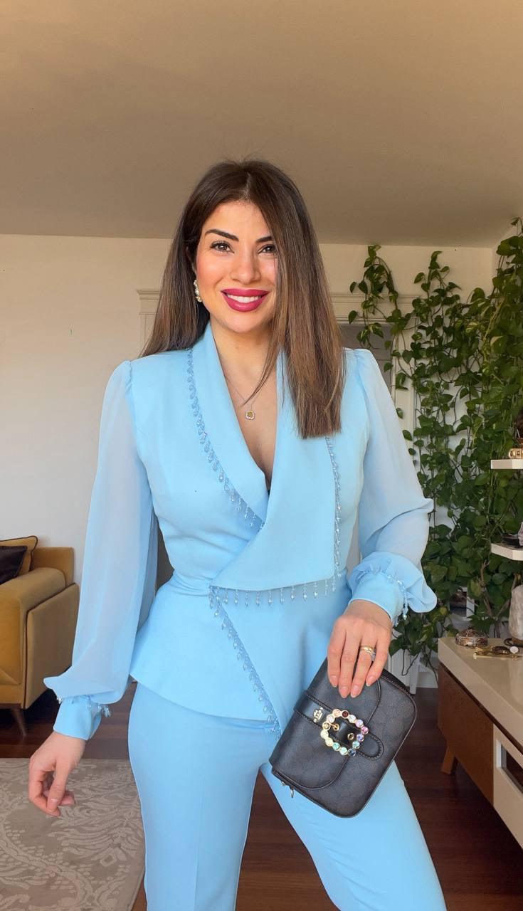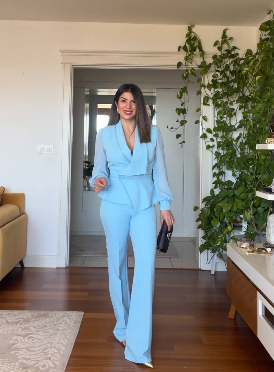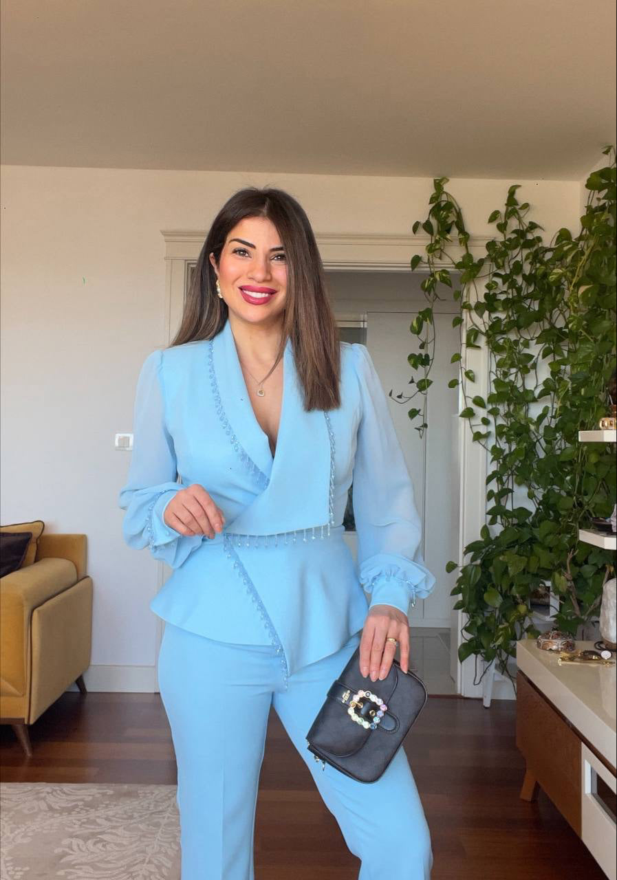 The top of the set has a fitted cut that hugs the body perfectly, offering a flawless fit for any shape. The bottom part has a simple, straight cut, which allows the details of the top to stand out. Additionally, the stone embellishments on the sleeves and neckline add extra elegance and refinement. This set is perfect for any special event or occasion. From New Year’s parties to weddings, graduation ceremonies to business meetings, it can be worn in any setting. Moreover, because black reflects timeless elegance, it can be worn in all seasons.