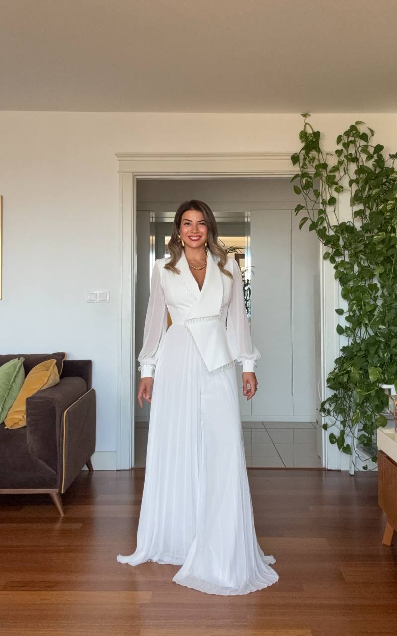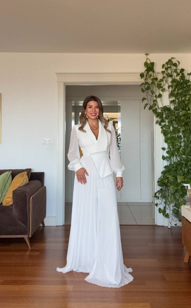 Offering an elegant and powerful style, the Chiffon-Sleeved Elegant White Jumpsuit ensures a striking look from special occasions to business dinners.