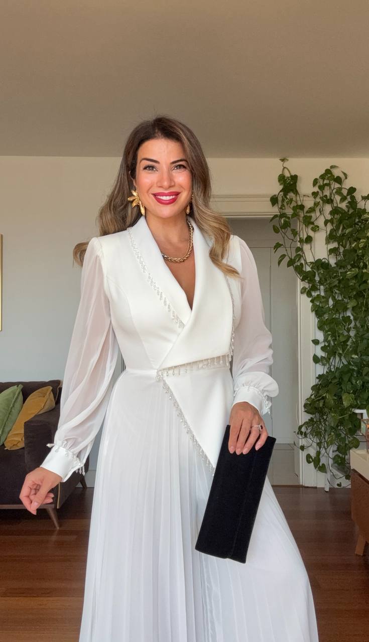 Pair it with gold-tone jewelry, a sleek clutch bag, and high heels to achieve a sophisticated evening elegance.