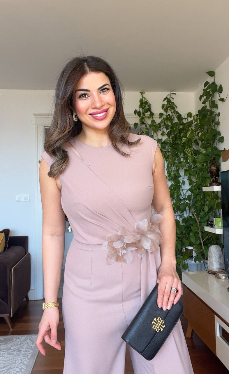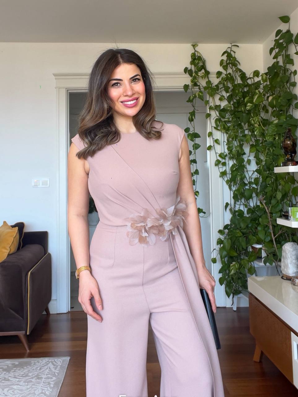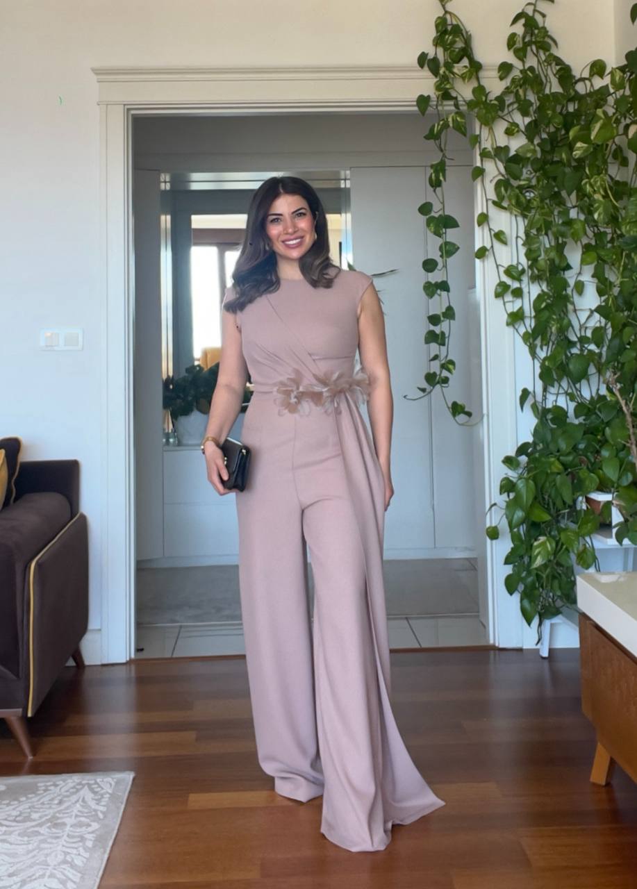 Blending modern lines with elegance, this beige jumpsuit brings effortless sophistication to any occasion. The subtle cut-out detail at the shoulder adds a contemporary touch, while the pleated fabric belt at the waist creates a flattering, feminine silhouette.