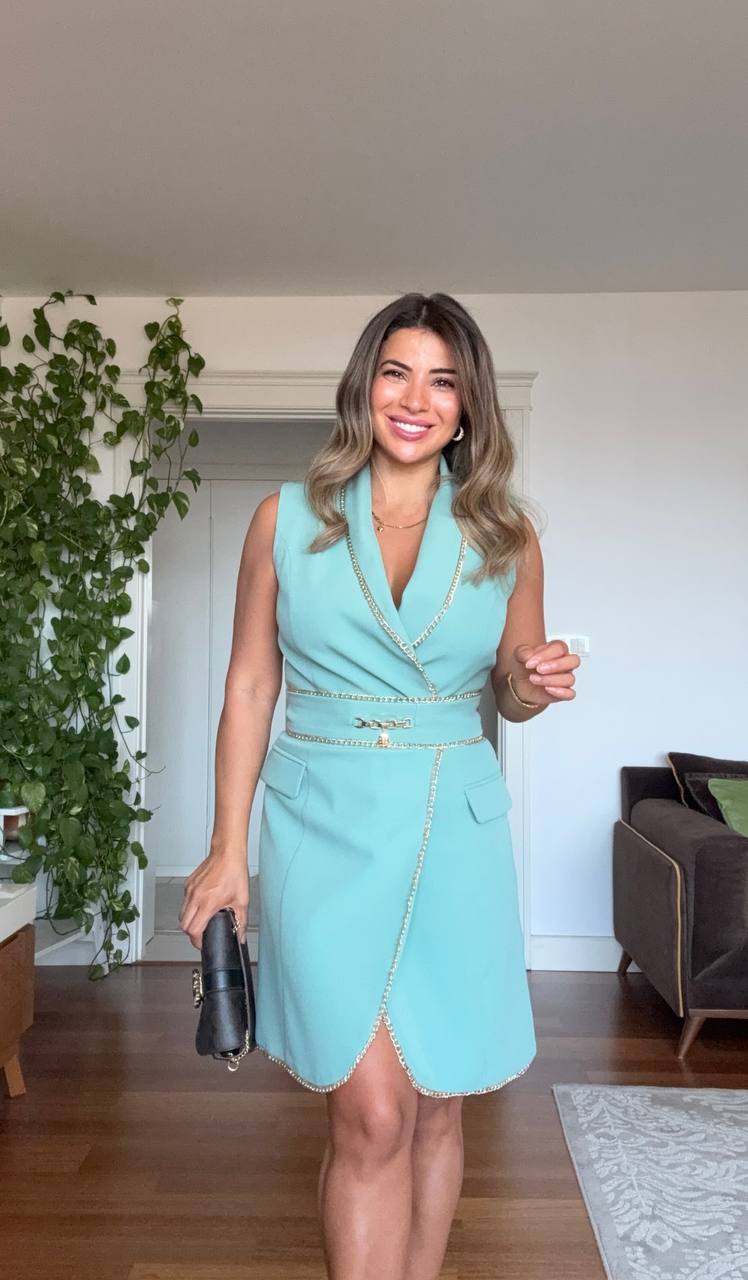 Redefining the power of understated elegance, this black wrap dress with gold chain accents is designed for women who embody both sophistication and strength. The delicate gold chain trimming along the neckline and waist adds a modern twist to the classic black silhouette.