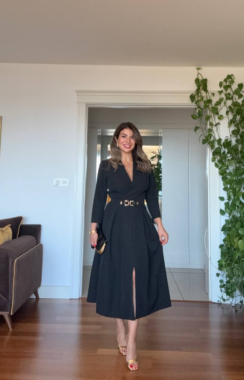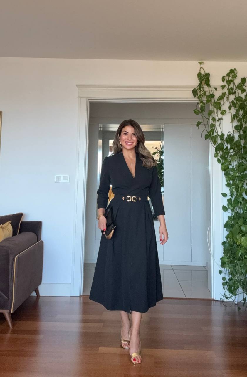 This timeless dress offers a modern and sophisticated elegance. With its flattering V-neckline and draped details along the body, it creates a graceful silhouette. The below-the-knee length makes it a perfect choice for both formal and special occasions.