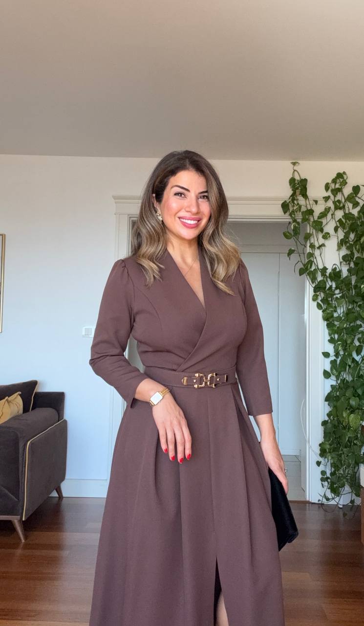 WRAP NECK BELTED MIDI DRESS - BROWN